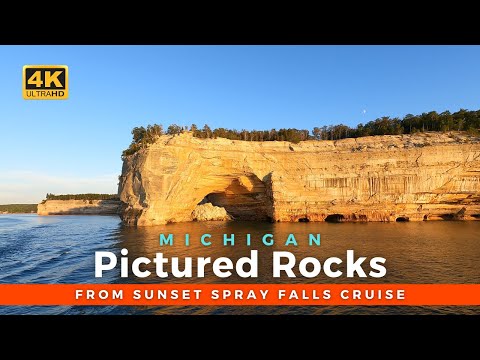 A close look at the Pictured Rocks National Lakeshore as seen from the Sunset Spray Falls Cruise in August 2021. Pictured Rocks National Lakeshore hugs the south shore of Lake Superior in Michigan’s Upper Peninsula. It's known for the dramatic multicolored Pictured Rocks cliffs. Unusual sandstone formations like Miners Castle and Chapel Rock define the park’s headlands.